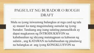 Ang burador ay isang uri ng panitikang popular sa Pilipinas. Ito ay isang maikling kuwento na may kinalaman sa krimen, kalokohan, at iba pang mga pakikipagsapalaran. Sa aking palagay, ang burador ay isang mahusay na anyo ng panitikan na nagpapakita ng kagitingan at katalinuhan ng mga Pilipino.May ilang mga punto na dapat isaalang-alang tungkol sa paggamit ng burador. Narito ang ilan sa mga ito:1. Voice (Boses):- Ang boses o tinig ng manunulat ay dapat na malinaw at makatotohanan. Dapat itong magpakita ng emosyon at damdamin upang maging kapani-paniwala ang kuwento. Ang boses ng manunulat ay maaaring maging nakakaaliw, nakakatawa, o nakakatakot depende sa tema ng burador.2. Tone (Tono):- Ang tono ng burador ay dapat na tumpak para maipahayag ang damdamin at mensahe ng kuwento. Maaaring maging malungkot, masaya, o seryoso ang tono depende sa layunin ng manunulat. Ang tamang tono ay makakatulong sa mga mambabasa na maunawaan at ma-appreciate ang kwento.3. Bullet at Numbering (Bala at Numerong):- Ang paggamit ng bullet at numbering ay makatutulong upang maayos at organisado ang pagsulat ng burador. Ito ay isang magandang paraan upang maipakita ang mga detalye at punto na nais ipahayag ng manunulat. Sa pamamagitan ng paggamit ng bullet at numbering, mas madaling maintindihan ng mga mambabasa ang mga kaisipan sa burador.Sa huli, ang burador ay isang napakahalagang bahagi ng panitikan sa ating kultura. Ito ay nagpapakita ng katalinuhan, kagitingan, at kagandahan ng pagsusulat ng mga Pilipino. Sa pamamagitan ng tamang boses, tono, at paggamit ng bullet at numbering, ang burador ay magiging isang napakagandang anyo ng panitikang maaring pagsaluhan at ipagmalaki ng mga Pilipino.