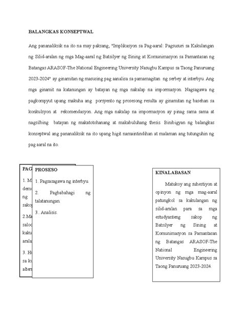 - Operasyonal na Depinisyon: Ito ay ang pagsasaalang-alang sa mga kahulugan at pagpapakahulugan ng mga konsepto. Sa pamamagitan ng operasyonal na depinisyon, mas maiintindihan ng mambabasa ang eksaktong ibig sabihin ng bawat konsepto.